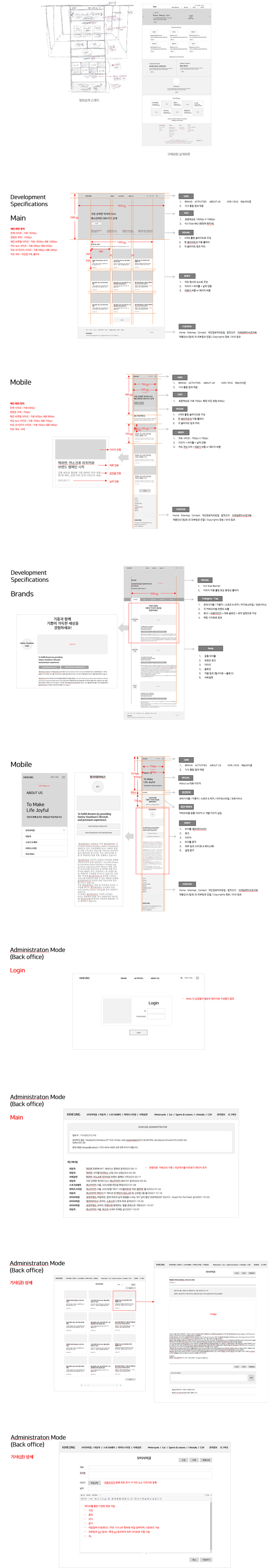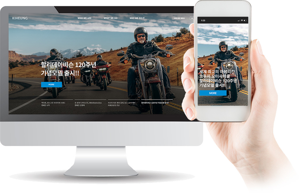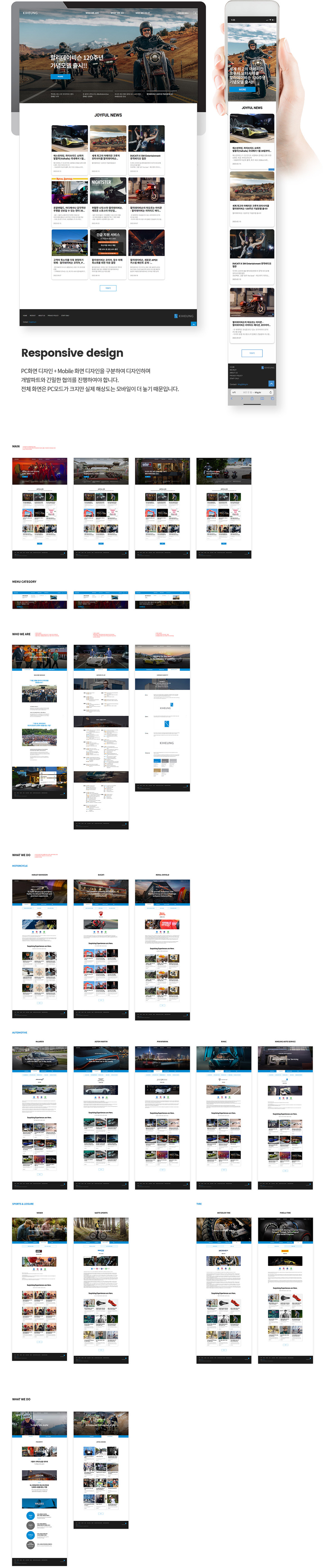 기흥그룹(할리데이비슨 본사)의 홈페이지는 대부분의 화면이 실시간 정보의 구성으로 이루어지도록 기획되었습니다. 각 브랜드별로 실시간 아티클을 구성할 수 있는 CMS는 관리편의성도 함께 갖추었습니다. 고객은 모든 브랜드 소개에서 고정된 정보를 계속 보는 것이 아니라 매번 실시간 업데이트되는 소식을 볼 수 있습니다.