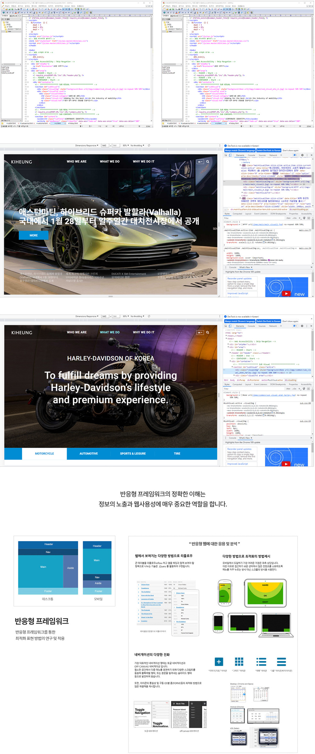 퍼블리싱은 표준형, 또는 반응형 등 다양한 형태로 진행될 수 있으며, 해당 프레임워크 부합하여 진행됩니다.